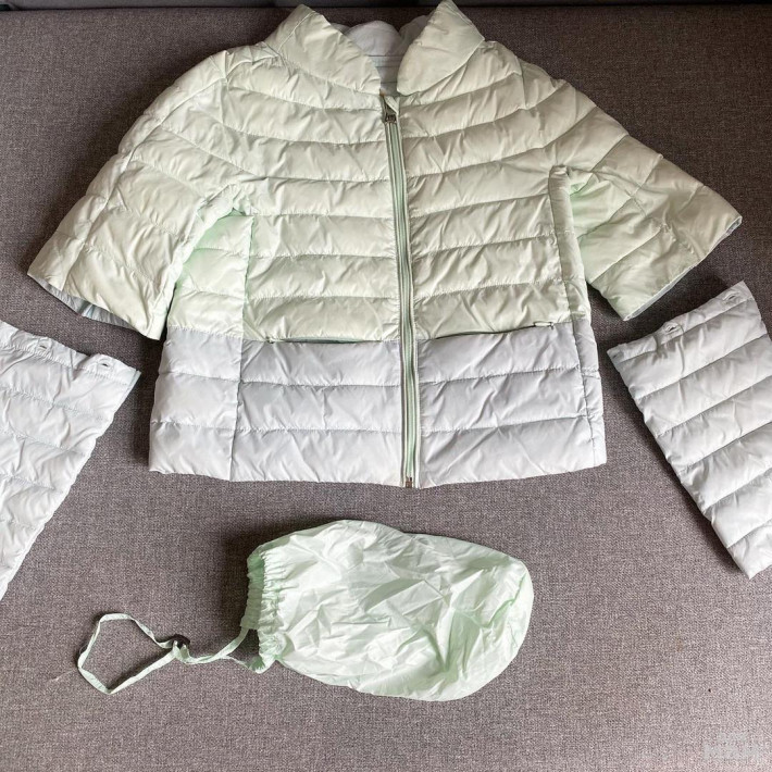 Лёгкая куртка-трансформер Conso в хорошем состоянии. Размер: 116-122 см. Фисташково-голубого цвета, сворачивается в мешочек. Рукава отстёгиваются. Замеры: длина - 45 см, грудь - 41, рукав от горловины - 55 см. Цена: 2000 руб.