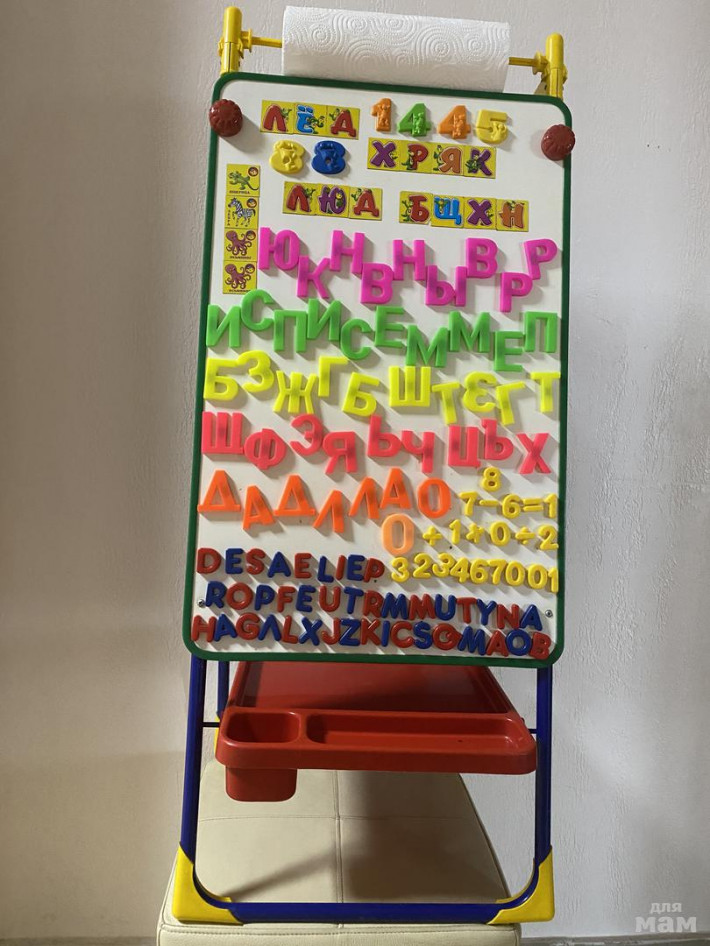 Мольберт с русским,английским алфавитом и цыфрами. Сверху вешается рулон ватмана, можно рисовать картины.Внизу удобная подставка для мелков,фломастеров.магнитов и т.д.Задняя панель для рисования мелками.Цена 1000 руб.ПРОДАНО!