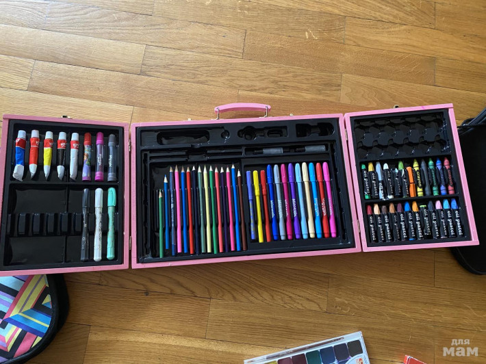 Все,что необходимо для развития маленького человека). Удобный размер магнитой доски-идеально для путешествия и для дома. Деревянные элементы яркие из натурального дерева! Отдельно покупали магнитную азбуку русскую,английскую и цыфры. Прекрасное состояние набора.