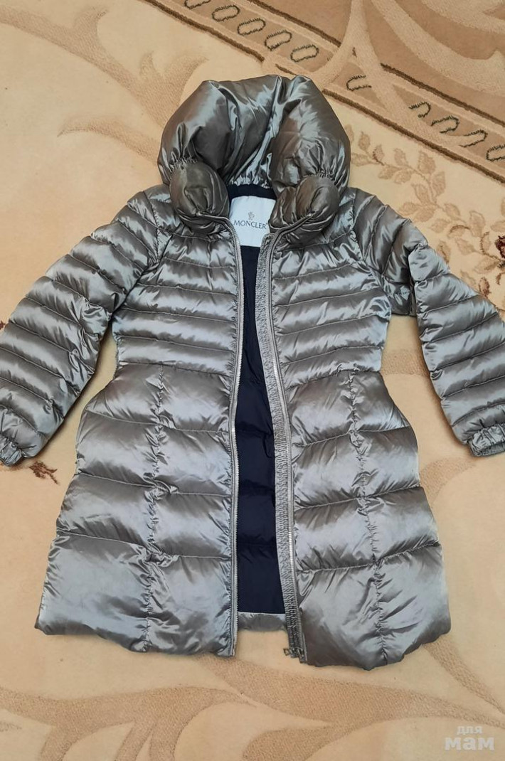Moncler монклер оригинал, пуховик, р. 5-6, цвет светло нюдовый металлик, нежнейший, пуховый, невесомый, приталенный, красивучий! По длине - до коленок. Закрывает горло от продува полностью.Курточка на родных замочках. Из нюанса строчка на спинке разошлась в 2 местах по 5 см. примерно., в носке не заметно. Цена с учетом нюанса. Девочка в нем - куколка!