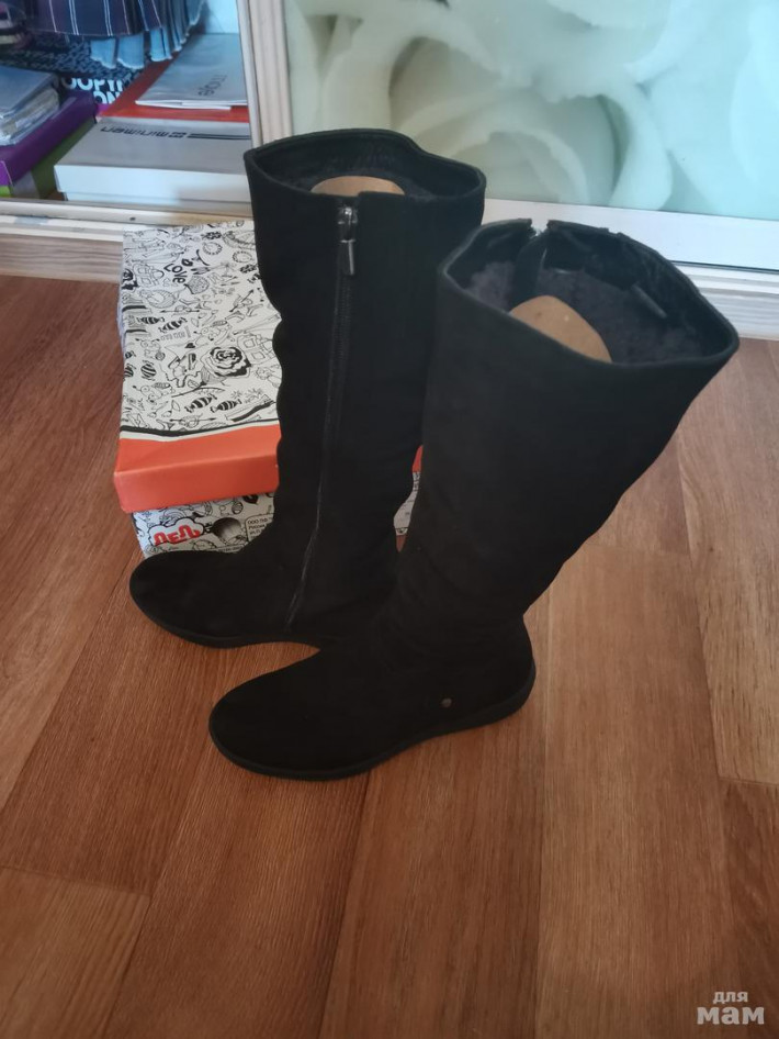 Сапоги Лель, натуральная замша, внутри толстый слой мех овчина, очень теплые, высота до колен, сидят по ножке. Р. 35. Состояние отличное, носили только в школу и то практически на машине.