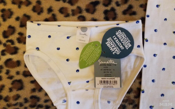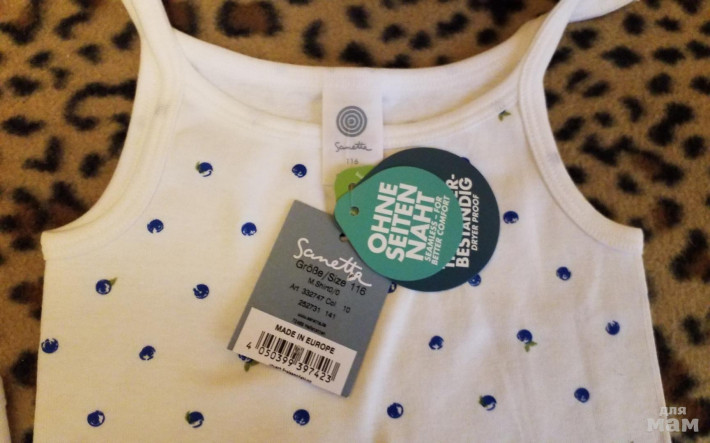 Абсолютно новый комплект с этикеткой майка и трусики Sanetta белые, с ягодками чернички, украшены бантиками. Германия размер 116 см. 5-6 лет Состав хлопок/эластан 95/5.