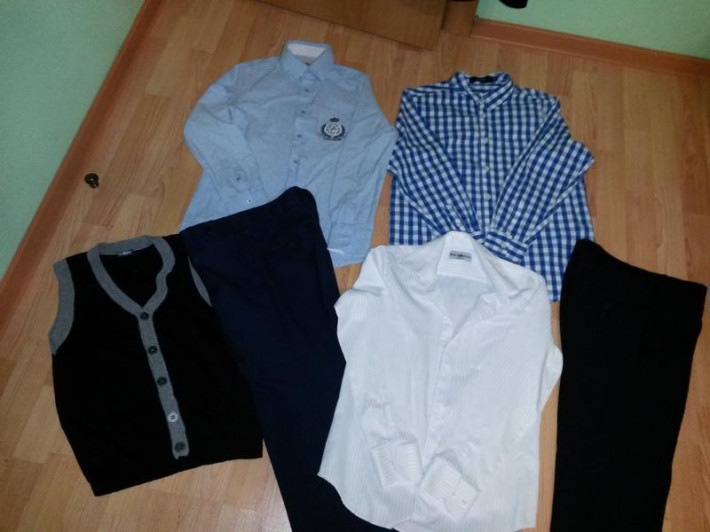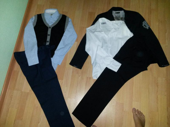 пиджак Cavalli, продан ; Gulliver двое брюк, черные в наличии 1200 и тёмно синие, 2000проданы; жилет черный с серым 500 в наличии, рубаха голубая в цветной мелкий горох,продана, рубаха в клетку bonprix 700 в наличии, белая рубаха benatsporr 800( цены как у гулливера) в наличии.фото мои , внизу есть каталожные.
