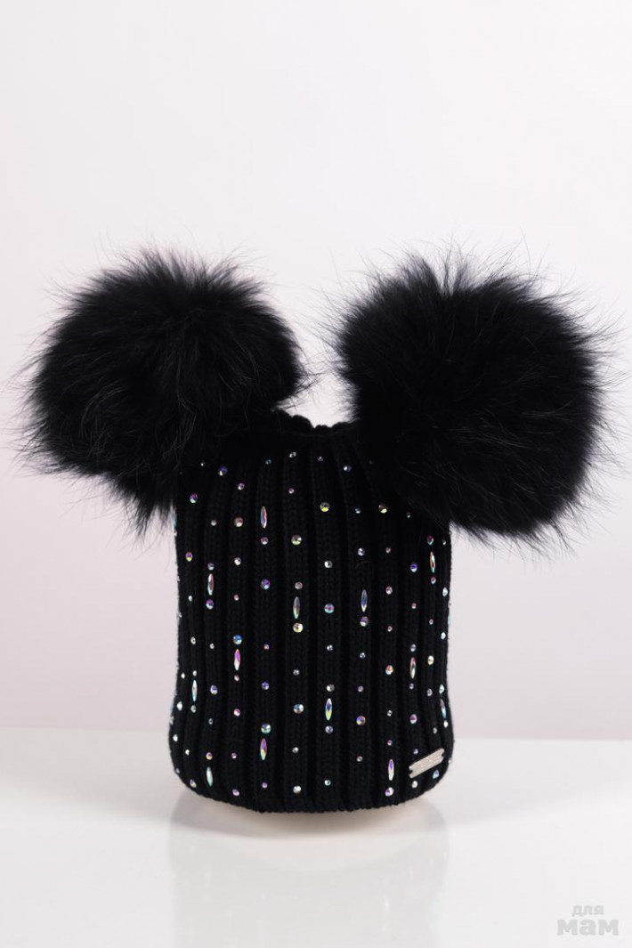 Модная шапка MiaLana от VIPShopping с двумя помпонами и стразами из 100% ИТАЛЬЯНСКОГО МЕРИНОСА всегда актуального и стильного черного цвета.