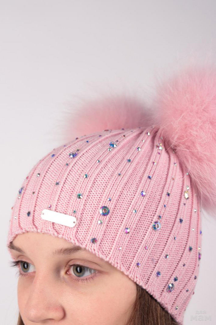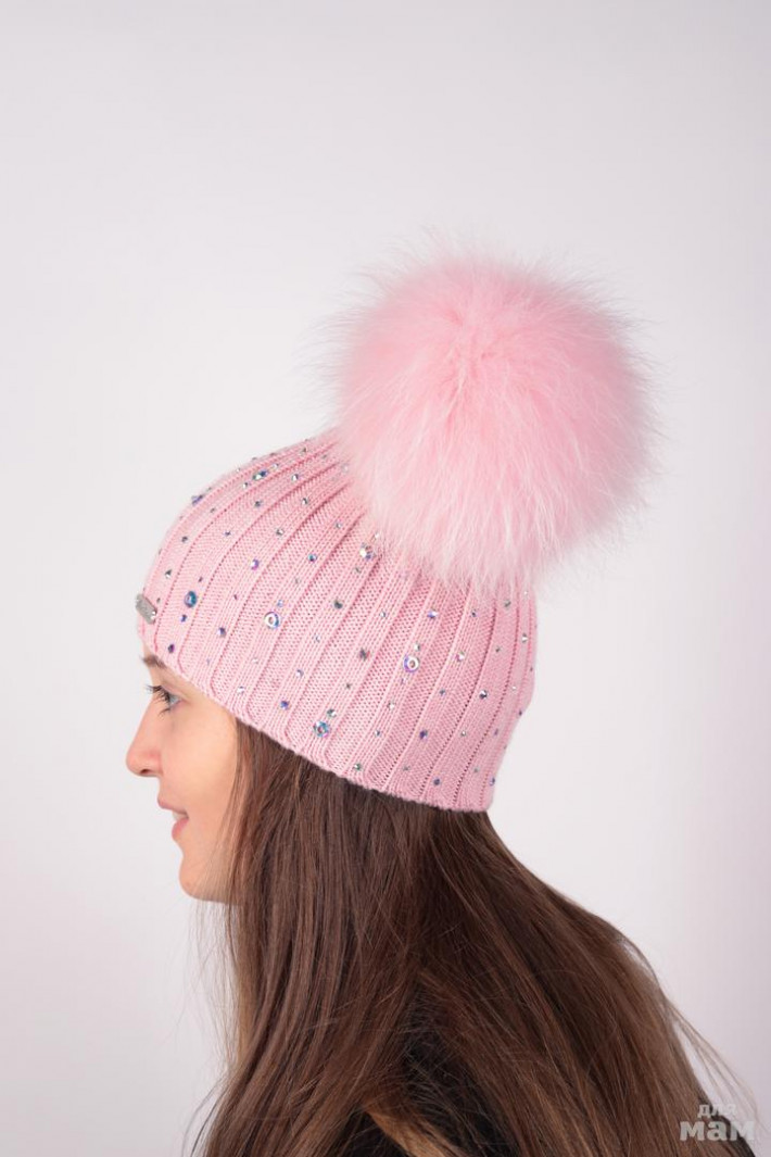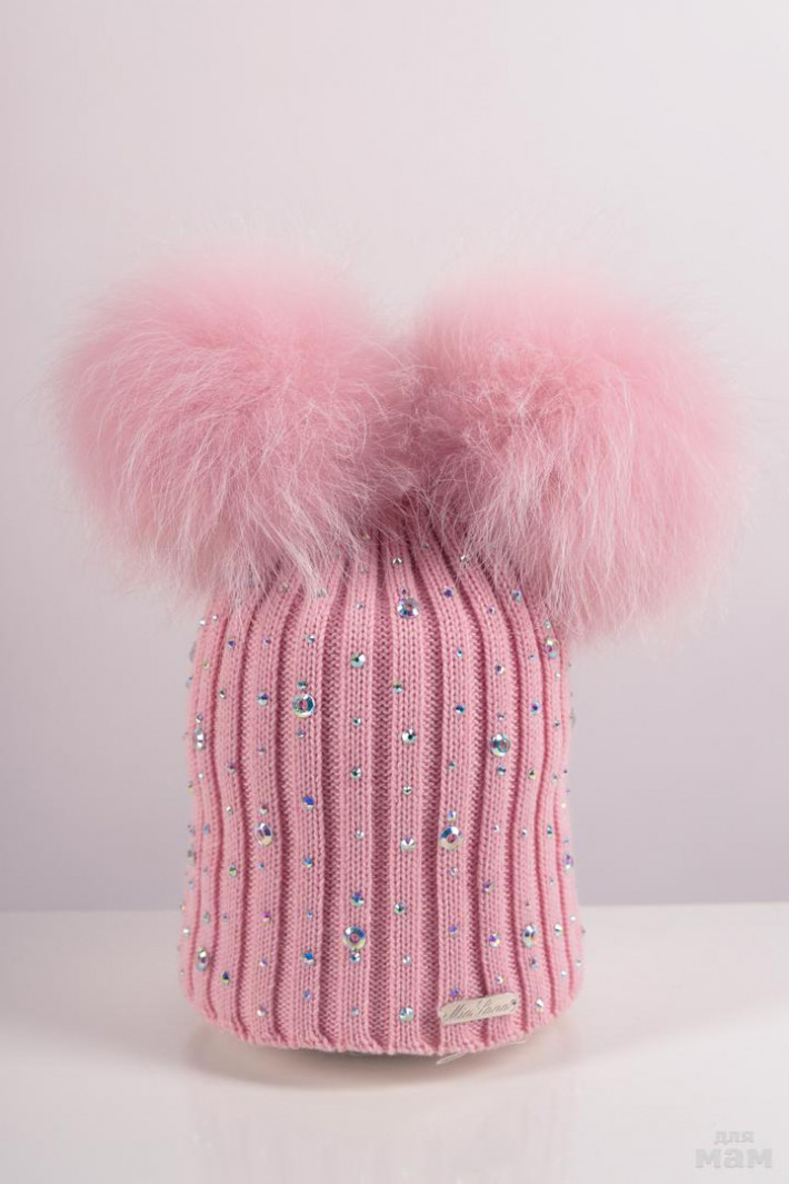 Модная шапка MiaLana от VIPShopping с двумя помпонами и стразами из 100% ИТАЛЬЯНСКОГО МЕРИНОСА нежного розового цвета.