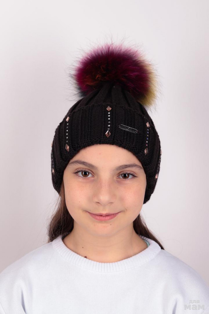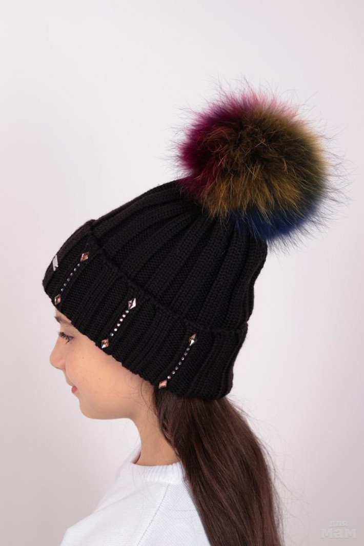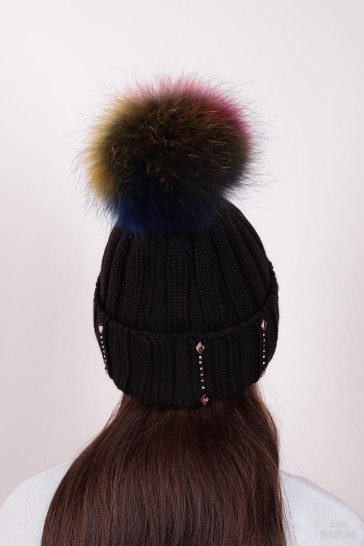 Черная шапка MiaLana от VIPShopping с помпоном и стразами из 100% ИТАЛЬЯНСКОГО МЕРИНОСА.