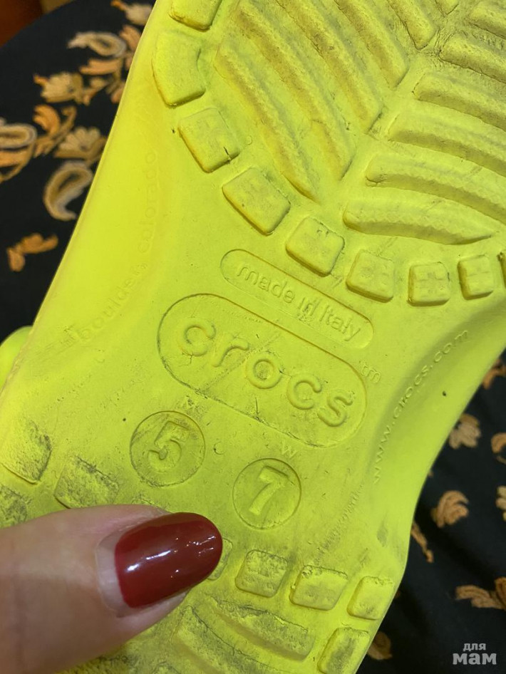 Размер 5-7. Сегодня девушка попросила фото подошвы , уточнить размер . И каково же было мое удивление -Made in Italy 🇮🇹! Покупала очень давно . Пересмотрела все Crocs (оригинал )своей семьи -дружественный Китай 🇨🇳 🤣.
