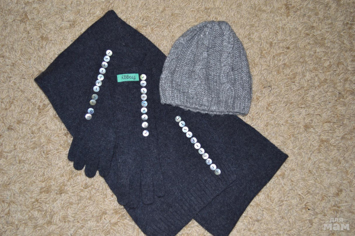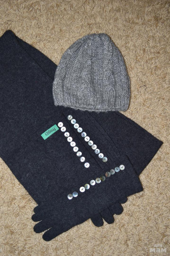 Комплект Шапочка (без подклада, на температуру до +5), шарф и перчатки в идеальном состоянии, одели пару раз, на девочку 7-9 лет. Подойдет под любой головной убор, очень мягкий, совершенно не колется, не маркий, высокие перчатки, декор пуговки!