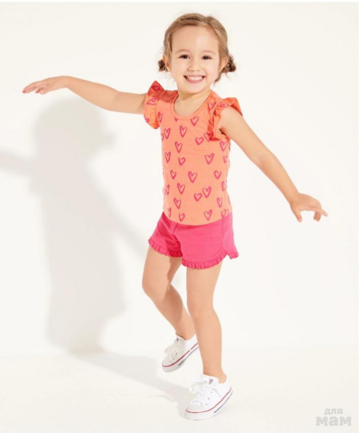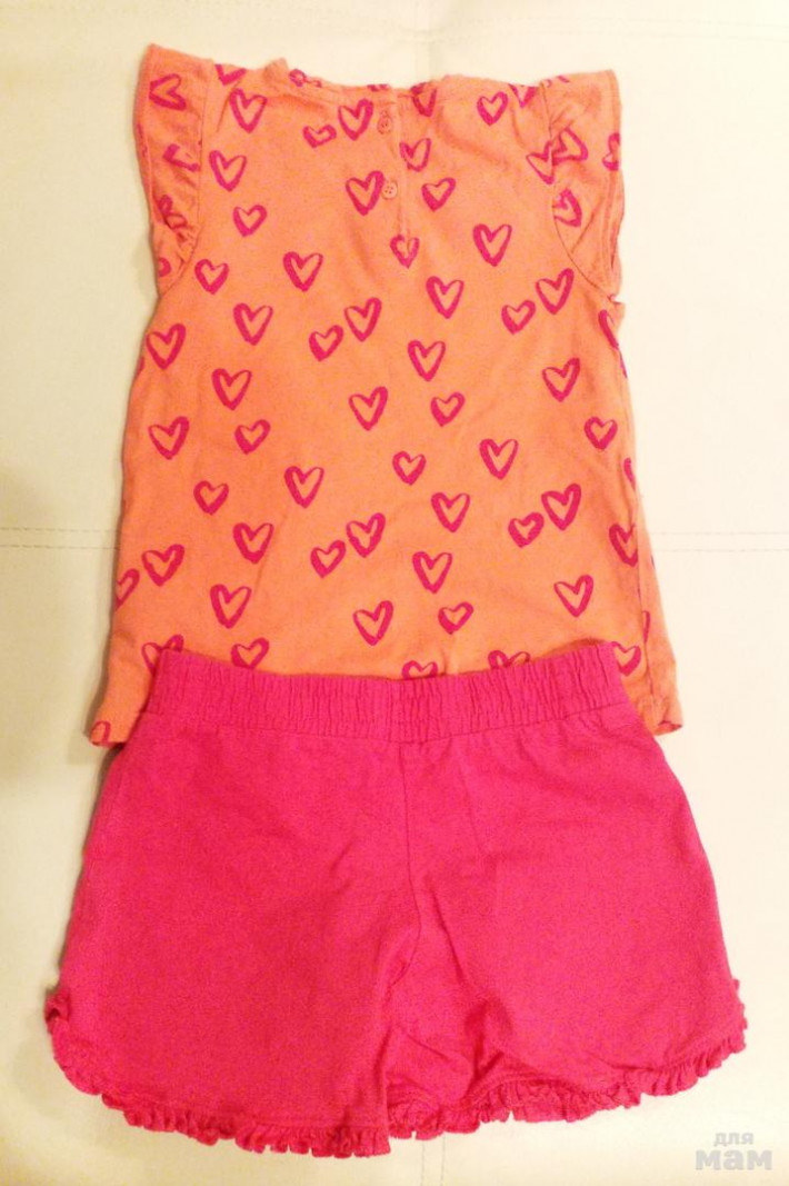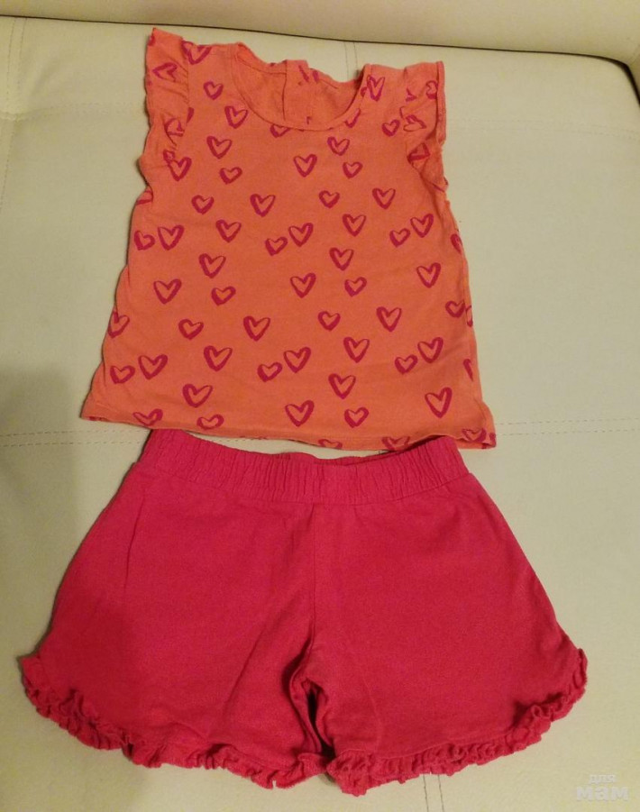 Яркий летний комплект, представленный футболкой в оранжевом цвете с рисунком из сердечек и шортами в однотонном розовом исполнении. Фирмы Mothercare. Размер 5-6 лет до роста 116 см, Размер 6-7 лет до роста 122 см., размер 8-9 лет до роста 134 см. Состояние отличное, было много летней одежды. 100 хлопок.