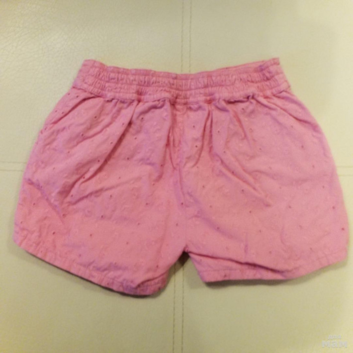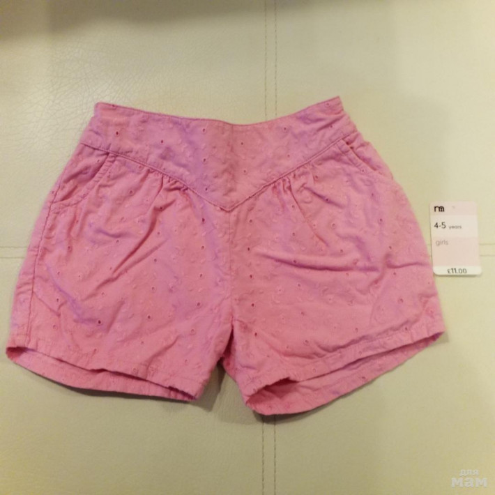 Шорты Mothercare Размер 4-5 лет. Состояние отличное. Не трикотаж. Плотный 100% хлопок с вышивкой Ришелье, на подкладке. Нежно розового цвета. С двумя карманами, сзади талия на резинке. Привозные, покупали в Англии за 11 £ (Британских фунтов), по курсу почти 2000 р. Если ребёнок худенький, то можно носить до 7 лет.