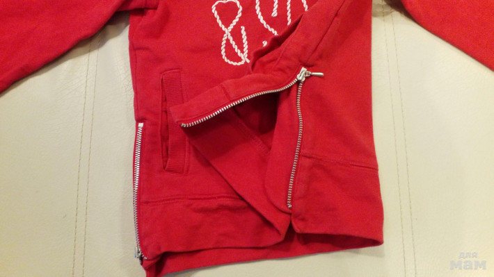 Джемпер толстовка фирмы Mothercare размер 6-7 лет до 122 см. Рукав немного укорочен, с подворотом. Имеет 2 вшивных кармана, молнии по бокам растегиваются, спинка на 2 см длиннее переда. Плотный трикотаж, из такой ткани часто шьют спортивные костюмы. 100% хлопок. Украшен объёмным принтом, сочный красный цвет. Покупала за 1800 р.