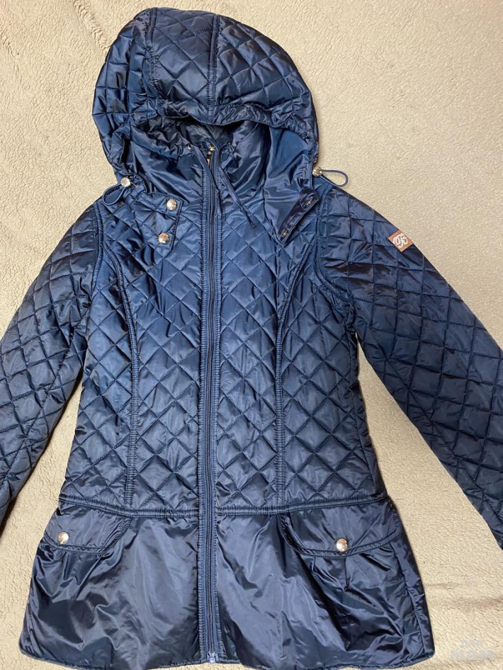 Куртка Alessandro Borelli. В очень хорошем состоянии. Размер 12, подойдёт на рост 158-164. Цвет темно-синий. Капюшон отстёгивается, в капюшоне, поясе и нижнем крае кулиски. В каждом элементе фурнитуры стразина, куртка просто отличная, неубиваемая, красивая.
