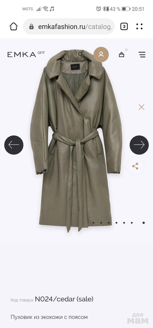 Пуховик из экокожи на утеплённой подкладке с пухом. Непродуваемая модель цвета хаки с интересным английским воротником. Прямой силуэт изделия можно регулировать поясом из комплекта. Отличительная особенность пуховика — свободный комбинированный рукав. Спереди на модели расположены два вместительных прорезных кармана.