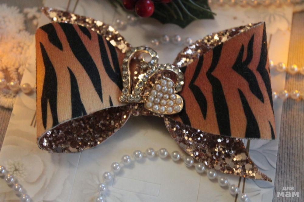 1 модный бант из двухстороннего материала; с одной стороны пайетки, а с другой замша с тигровым окрасом))))