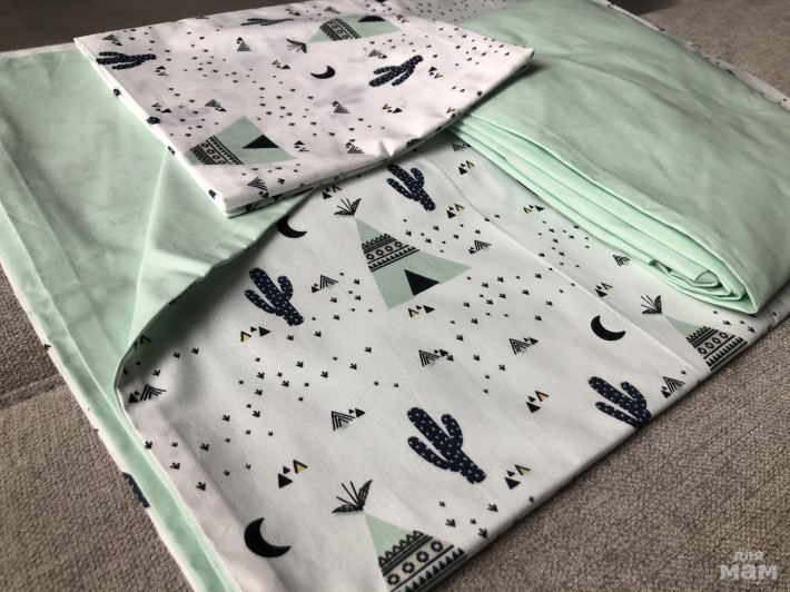 Постельное белье «Вигвамы и кактусы», размеры: простынь на резинке мята( 90*180), простынь на резинке смен-белая полоска ( 90*180), пододеяльники двусторонние ( 140*190), наволочка (50*70). Один комплект с простынью в полоску, другой с однотонной простынью в цвете мята. Прекрасно подойдут как мальчикам, так и девочкам. Можно деткам для двухъярусной кровати. Постельное белье прекрасно и смотрится в интерьере. Выполнено из 100% хлопка. В каждый комплект входит 1 наволочка. Все изделия я шью сама с любовью и от души. Цена 3200 руб - 1 комплект. Почта 350-500руб. Отвечу на любые вопросы и сделаю любые фото. ( 1 комплект с простынью в полоску продан, остался с простынью в цвете мята)