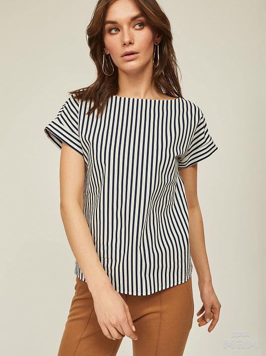 Блуза свободного кроя, выполненная из 100% хлопка. Вырез-лодочка, короткие широкие рукава с отворотами