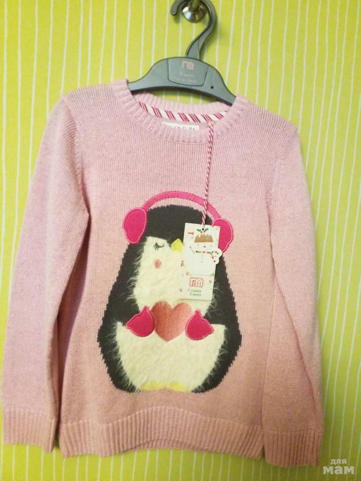 Новый, с этикеткой. Джемпер Mothercare размер 5 лет. Хлопок 84% с люриксной ниткой, украшены вышевкой в виде озорного пингвина. Мне кажется большемерит, до 7 лет. Покупала 1950 р.