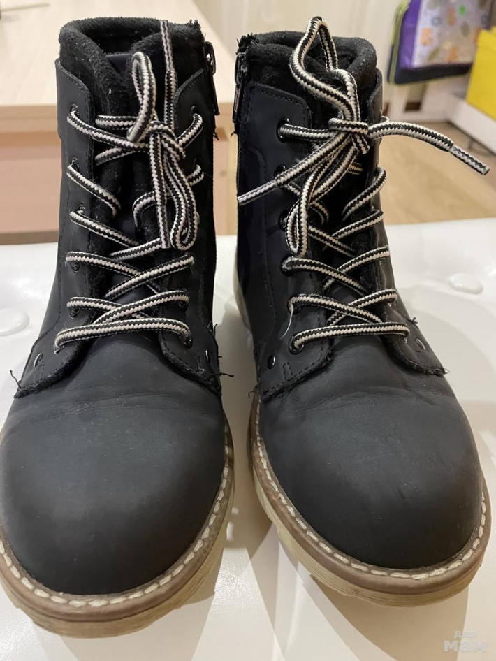 Демисезонные ботинки, материал верха - искусственная кожа, внутренний материал и стелька - тонкий флис. Сезон весна/осень. Мягкие и удобные. Размер 33, стелька 21см. Сбоку на молнии, шнуровка для регулировки полноты(подъема). Состояние хорошее, но следы носки конечно есть. Ботинки помыты и почищены снаружи и внутри. Та серость на подошве, которая осталась, уже не поддаётся чистке.