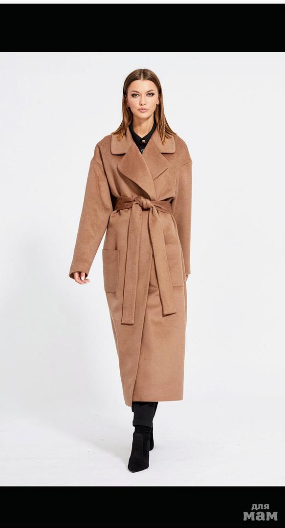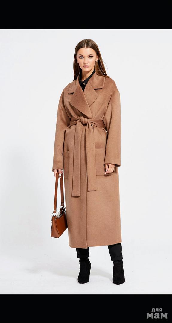 Пальто выполнено из пальтовой однотонной ткани с ворсом. Пальто прямого силуэта. Спереди застежка центральная на кнопки, карманы накладные. Спинка со средним швом со шлицей по низу. Плечевой шов спущен. Рукав одношовный, с локтевой вытачкой. В боковых швах шлевки для пояса. Пальто на притачной по низу подкладке. В комплект входит съемный пояс из основной ткани.