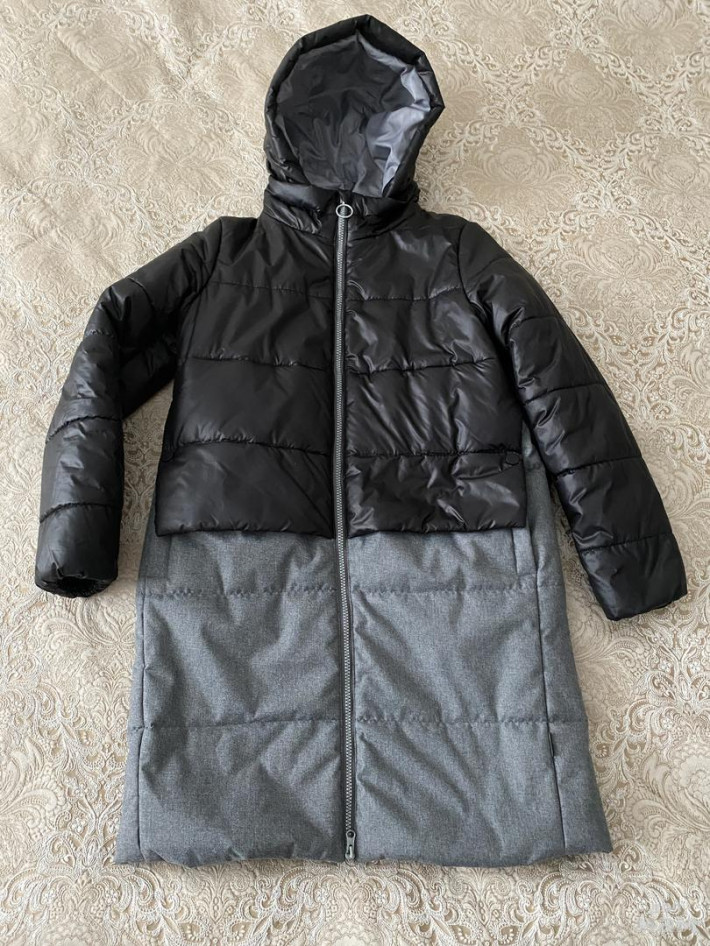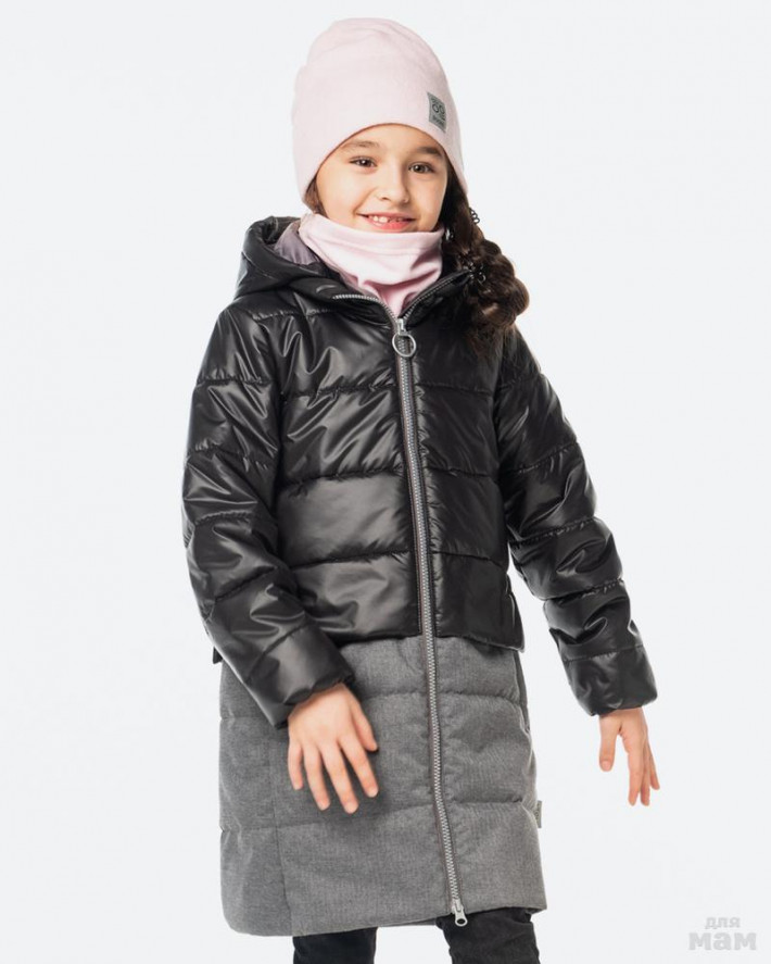 Осеннее пальто для девочки из плотной водоотталкивающей и ветрозащитной ткани,верх черный цвет, с серым.Контрастное сочетание тканей