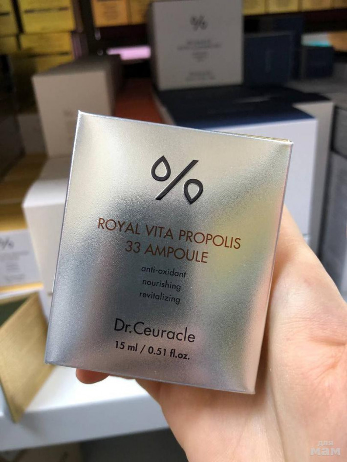 Ампула с прополисом для улучшения тона Dr.Ceuracle Royal Vita Propolis 33 Ampoule активно восстанавливает кожу, улучшает ее текстуру, возвращает гладкость и эластичность, выравнивает тон. Средство осветляет нежелательную пигментацию и постакне и препятствует появлению пигментных пятен. Содержит экстракты прополиса и маточного молочка, ниацинамид и 3-О этил аскорбиновую кислоту.