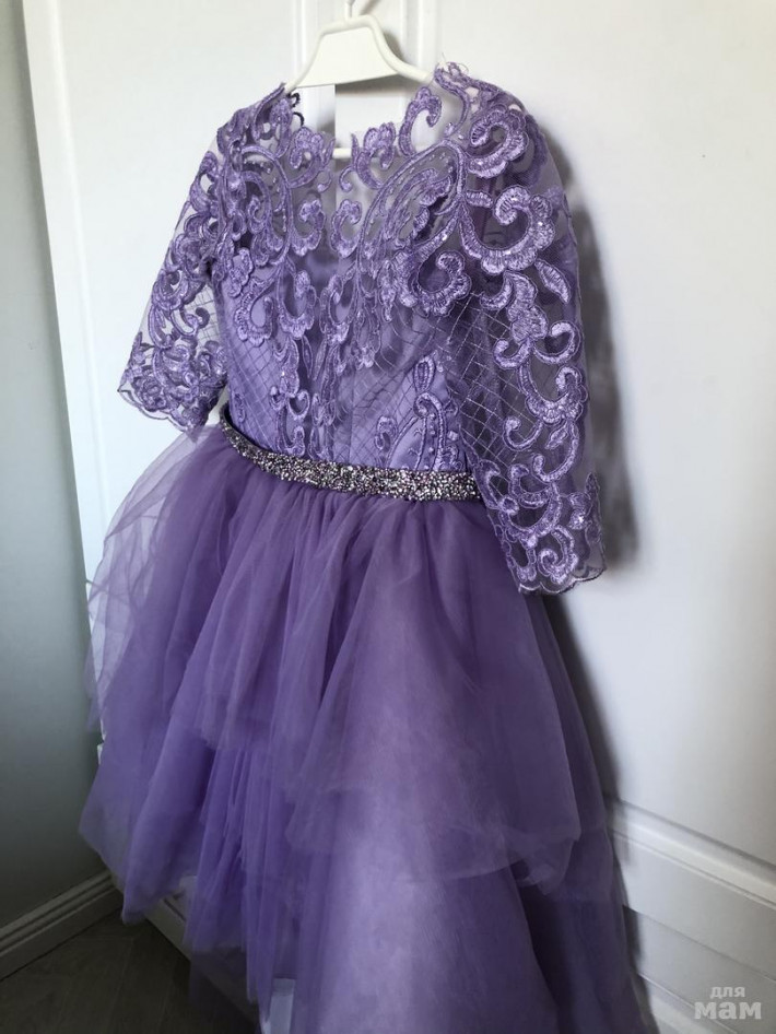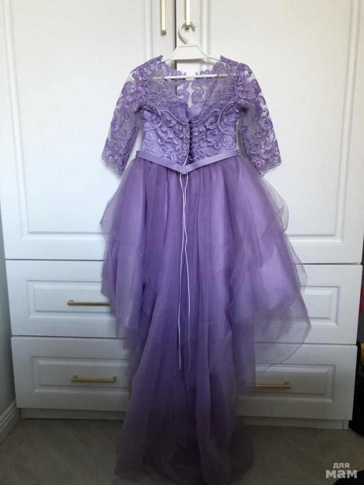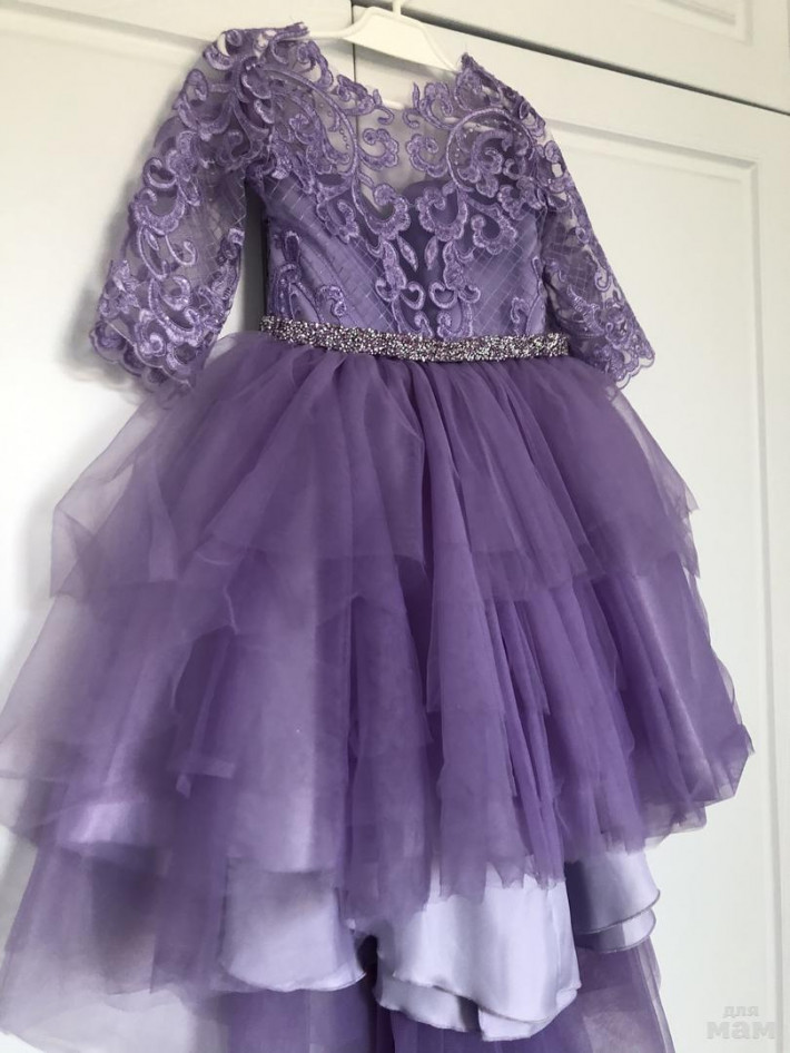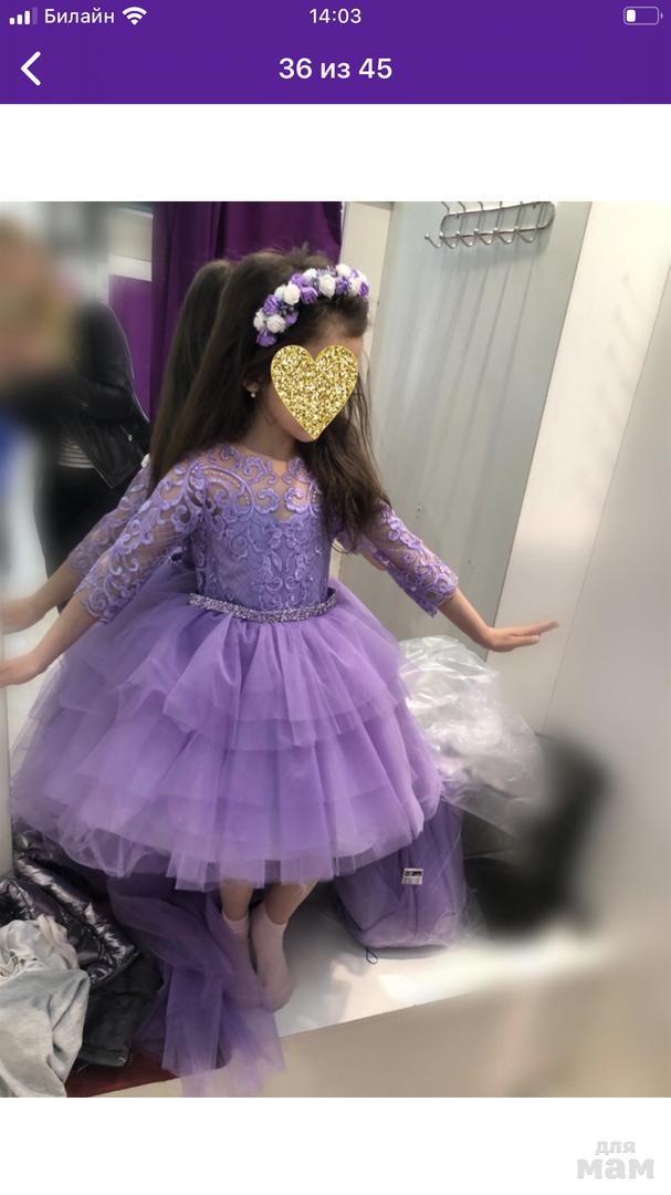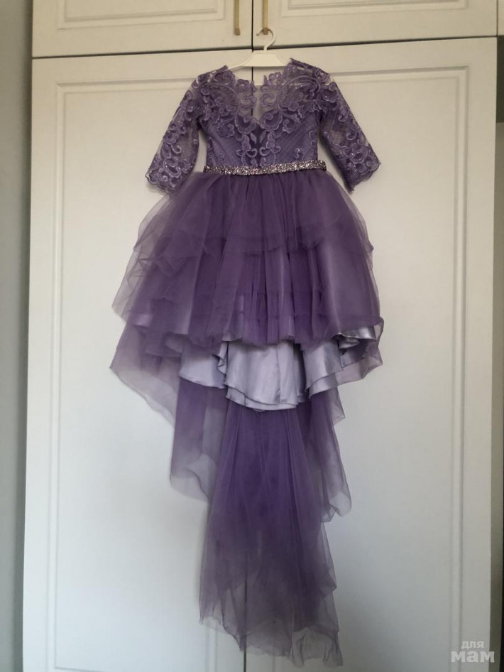 Очень праздничное, роскошное платье для выпускного и любых торжественных случаев. Длина от плеча до коротких юбок 63см, длина от плеча до самой длинной точки шлейфа 128 см, полуобхват груди 32см. Подходит и для худышек и для плотненьких, так как сзади корсетная утяжка. На фото дочка 119см. Из нюансов: дырочка маленькая на одной из передних юбок и на самом конце шлейфа, незаметные. Очень эффектное платье. Цена 3000+ почта400руб