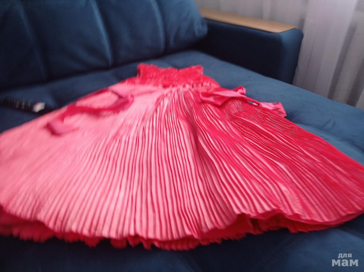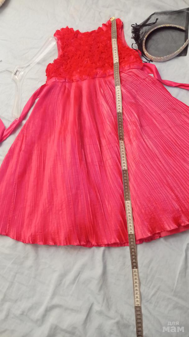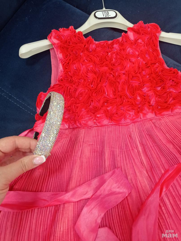 Очень яркое) маркировка 8 . После химчистки а некоторых местах есть точки.как дырочки+ енного порван внутри подъюбник . Можно носить лет до 10. 3 д цветы на груди..будет шикарно смуглой девочке . Ободок шикарный моя не хочет носить не надевали+500 р .Платье носили ,на отдыхе ..помялось но оно всё рано шик .как разгладить не знаю но на ребенке это все не видно