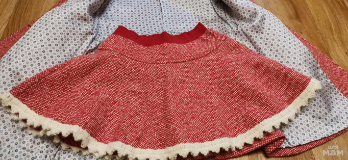 Твид, двухцветный узор, пальто внутри на подкладке. Юбка модель-солнце, эластичный пояс.