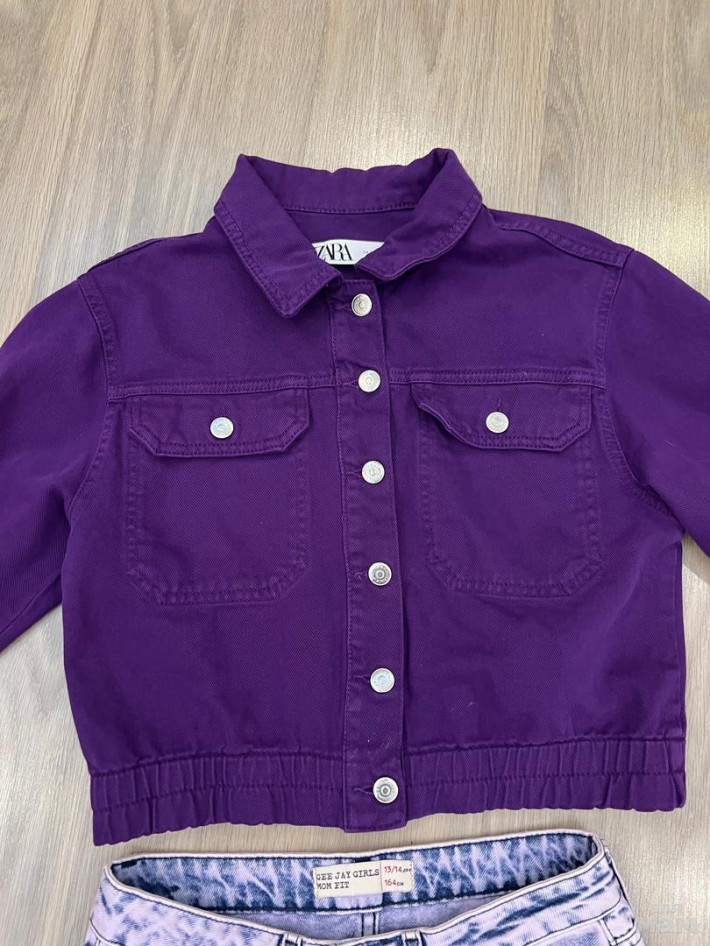 Джинсы-варенки Gee Jay Girls р.13/14 лет, 164 (шаговый 70, талия 35, длина 95, бедра 43). Новая джинсовая фиолетовая куртка Зара, р.S, рукав 56, под мышками 45, длина 47. Комплект 2000 р.