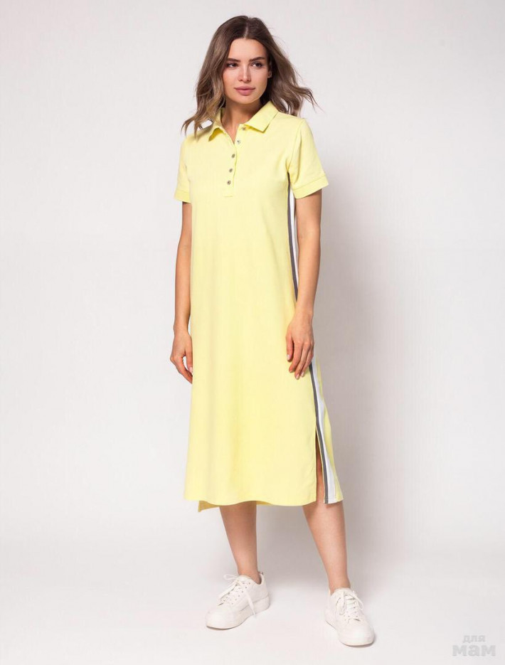 Платье-поло из классической ткани "пике" с дизайнерским плетением ворота и манжетов. Трендовая асимметрия достигнута за счет наличия яркого лампаса с одной стороны. Лампас двуцветный, внизу этой боковой линии разрез. В поддержку лампаса пуговицы белого цвета. Свобода облегания и длина изделия также актуальны в текущем сезоне.