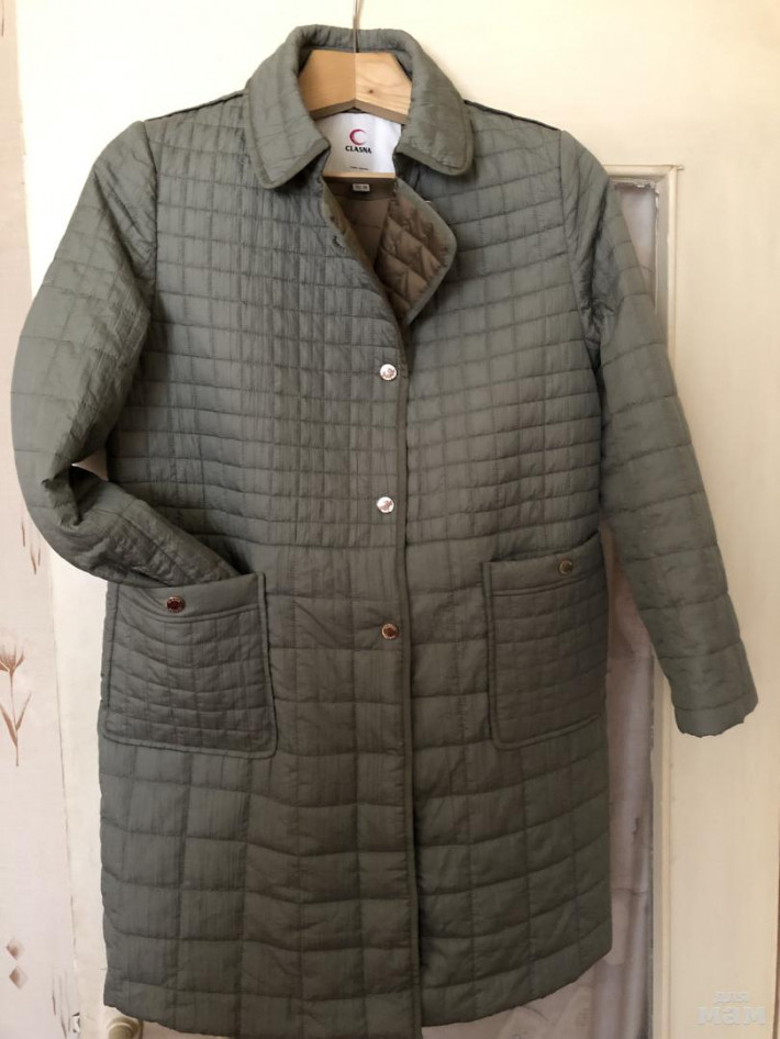Пальто стеганое на весну-осень. В отличном состоянии, мало б/у Цвет фисташка бежево-зеленоватый очень спокойный, ни как не смогла поймать его на фото. Застежка на кнопки. Замеры: длина 90см, по груди 54, по бёдрам 59см, длина рукава 60см.