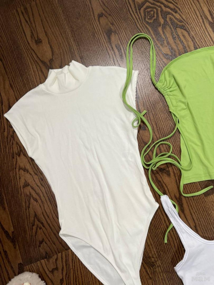 Новые топы: белый с воротом Зара боди, р.S с коротким рукавом, новый салатовый топ с голой спиной на завязках сзади, белый двойной короткий топ
