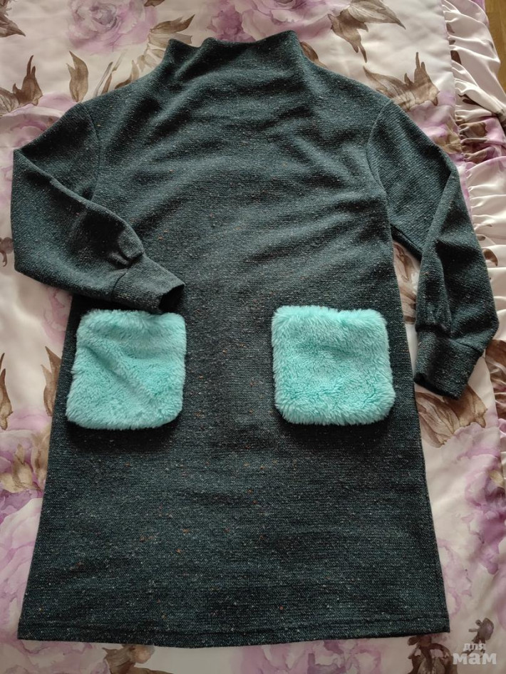 Платье с меховыми кармашками. Невероятно крутое. Дочь его просто обожала. Маркировка 152, можно носить до 158 точно. Состояние отличное. Между проймами 45, длина по спинке без ворота 80.