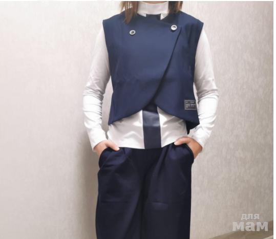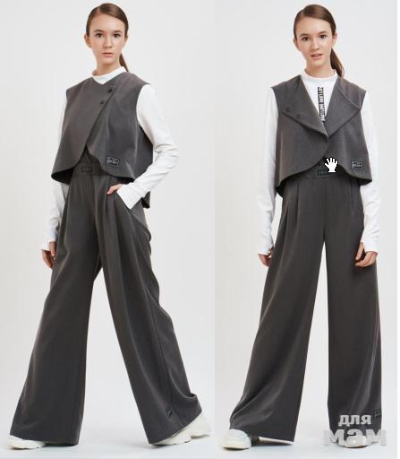 Описание: жилет, свободного кроя, без подкладки, со смещенной застежкой на кнопки, с фигурным низом и встречной складкой по спинке