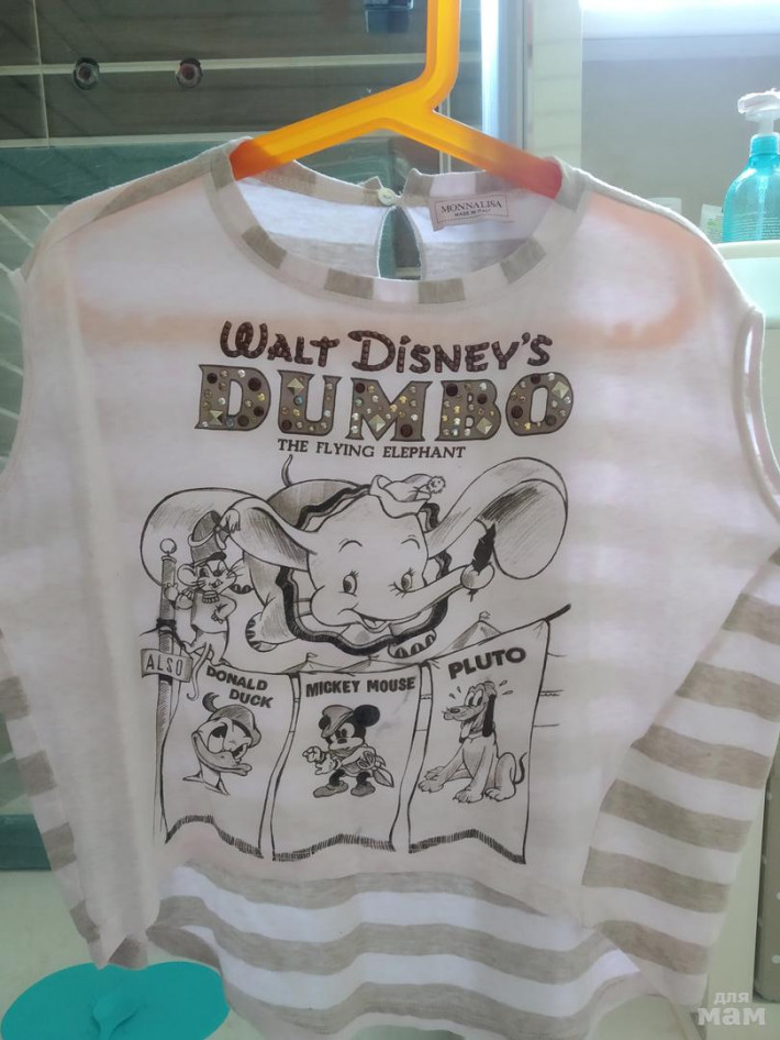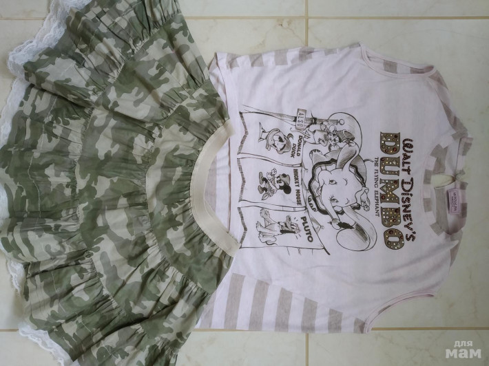 Очень красивый костюмчик, юбочка пышная солнцеклеш и свободная футболочка с узнаваемым принтом украшенным стразами....100% оригинал...состояние отличное..