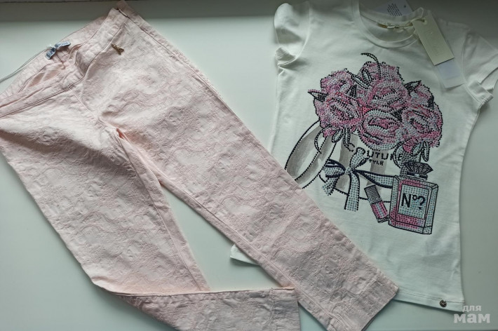 Безумно красивые и нежнейшие бриджи из хлопка-жаккарда! Размер L, идут на 9-10 лет. Отлично стройным девочкам. Нежно розовые (чуть ярче чем на фото). К бриджикам могу предложить футболочку 134 см Мисс Грант.