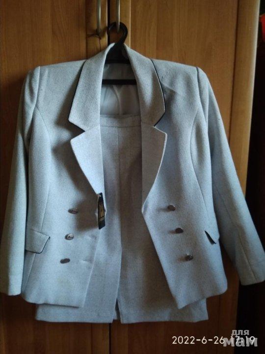 Новый, плотный. Внутри и в пиджаке и в юбке мягкая подкладка, типа шёлка 🙂 Юбка на пуговичке и короткой молнии сбоку. Размер указан 48, но на мой 48 маловат (особенно юбка). 😢 Поэтому скорее 44-46.
