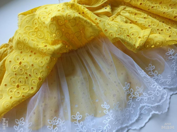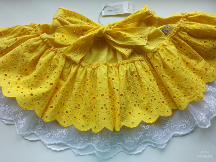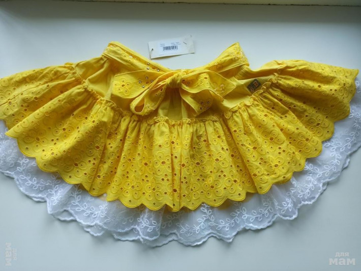 Юбка лимончик, очень яркая, красивая, пояс украшен стразами и стекляриусом, ручная работа - шитьё! Стоила космически дорого. Размер по бирочке 13/14 л, но я бы рекомендовала лет с 10-11 спокойно,так как в талии по всей спинке идёт регулировка (вставлена резиночка), талия максимал 36 см, но можно утянуть до 29-30 см легко. Длина юбочки 36 см.