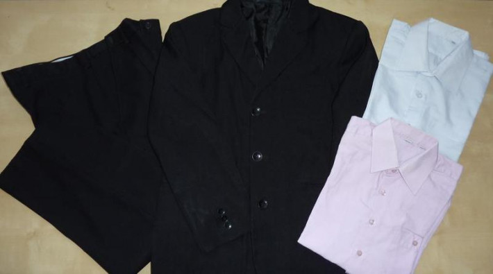 1. Полушерстяной костюм черного цвета: брюки и пиджак + 2 рубашки р.140-146 . Костюм ф-мы Bremer Start. -1200руб.