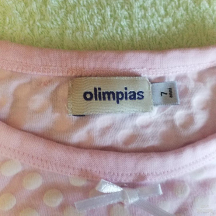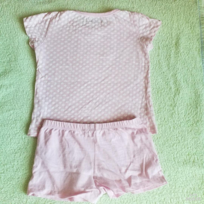 Отличная Пижама Olimpias р. 7 лет. Состав хлопок с лайкрой. Нежно розового цвета в принт горошек и сердечек, украшена большим сердцем с надписями. Очень приятная к телу. Шорты 100% хлопок. Состояние очень хорошее.