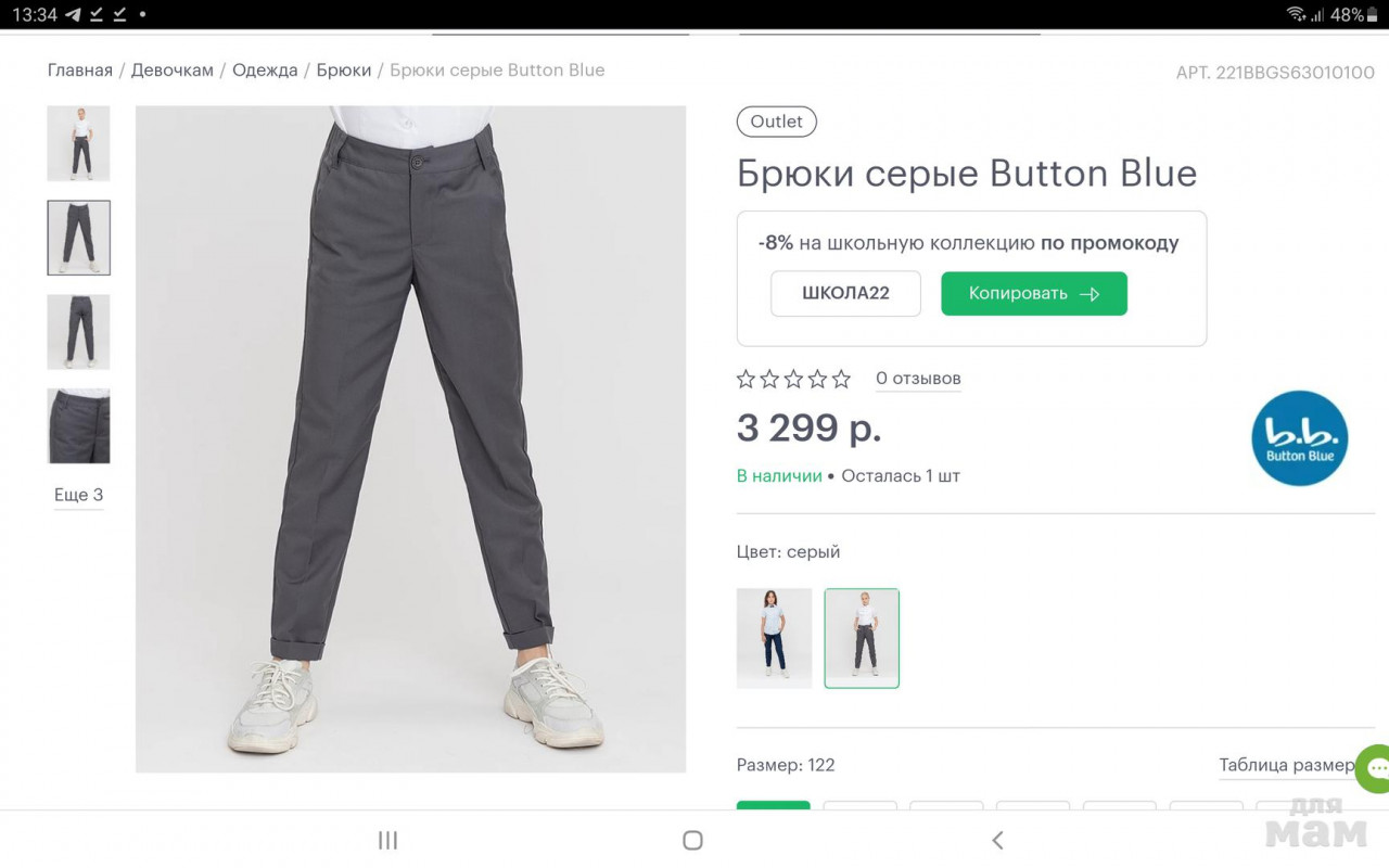 Брюки серые р. 122, фирмы Button Blue. Состояние очень хорошее, б/у мало. На худенькую девочку. Комфортные брюки базовой модели - основа гардероба. Для тех, кто ценит комфорт и стиль. Они были с подворотом, но мне показались коротковатыми и я подворот разгладила. 80% полиэстер, 20% вискоза. Покупала за 3300 р.