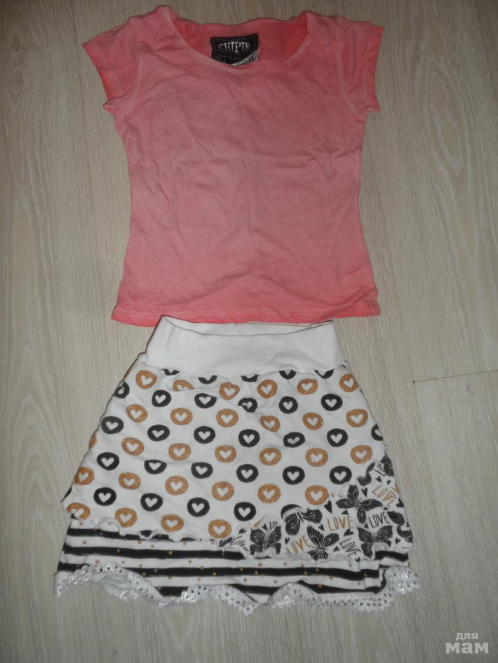 5 фото. Новая юбка на 6-9 лет из Франции, красивая, плотный трикотаж, модель суперская. Цена 450 руб. Футболка Q&D стильная, нежная мало б/у цвет супер на 7-9 лет. Цена 240 руб. Комплект за 600 руб.