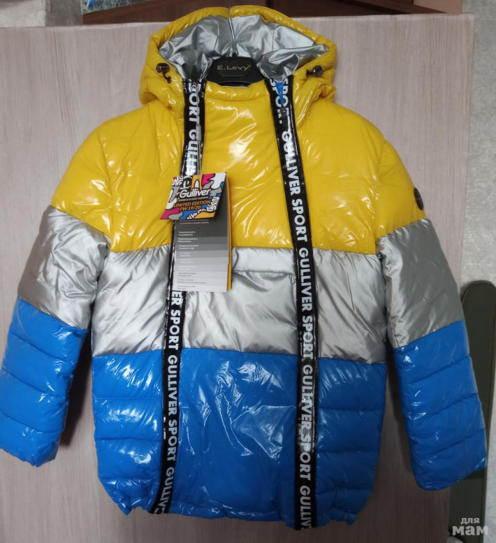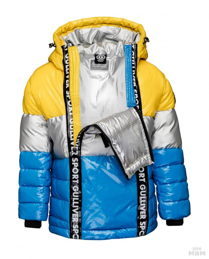 Куртка построенная на комбинации трех цветов: ярко-синего, желтого и серебристого.
