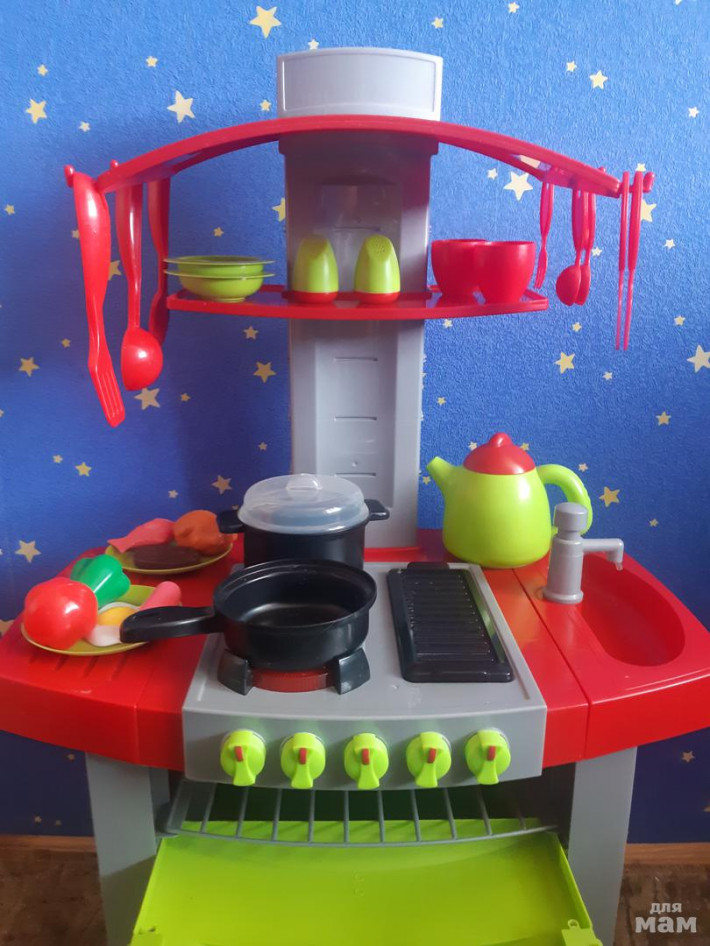 Можно мыть посуду настоящей водой из крана. В комплекте посуда и продукты.