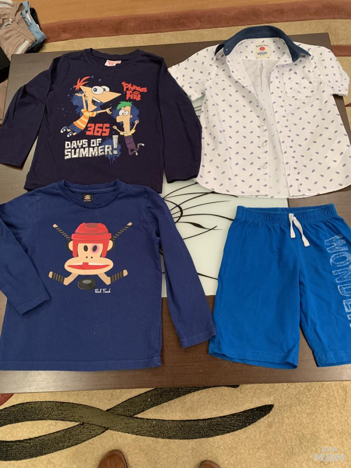 Футболка т.синяя р4 цена 80₽; PAUL Frank р.4 цена 120₽; шорты р.4 цена 80₽; рубашка Button blue р.5 цена 220₽. Все вещи в очень хорошем состоянии. Почта и др, самовывоз Павловский Посад.