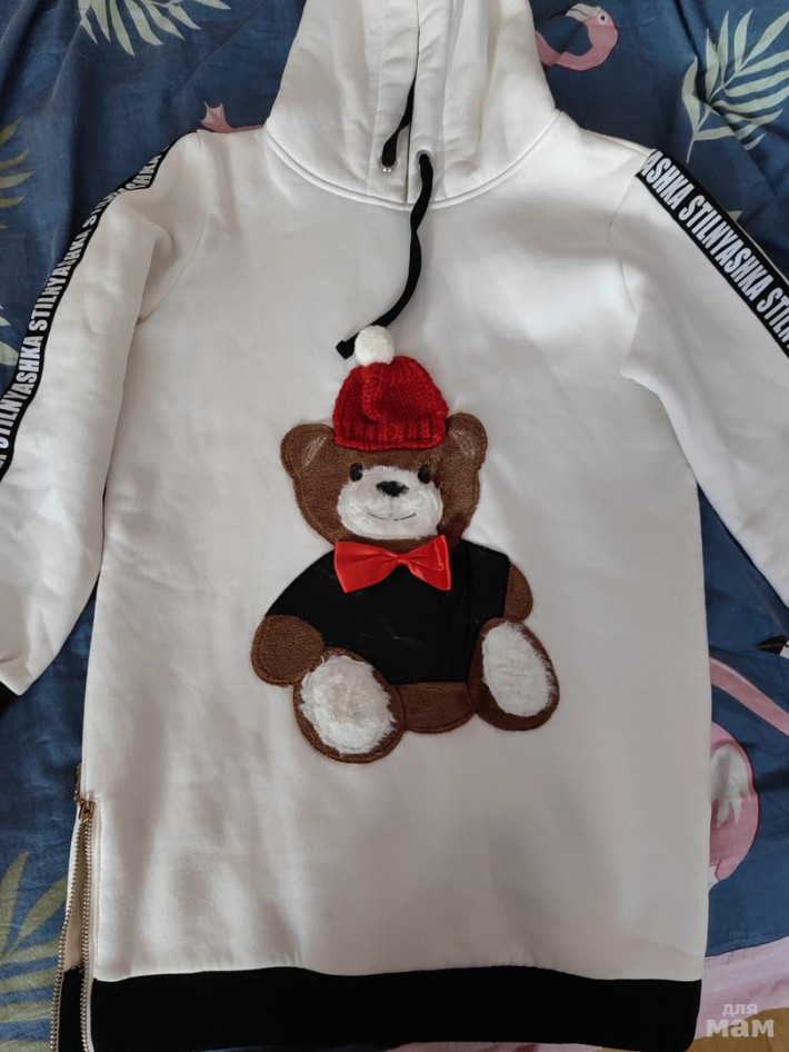 Любимое тёплое платье! Маркировка 146-152, полноразмерное. Обалденное! Медвежонок в кожаной тужурке и настоящей шапке с помпоном. По бокам замочки. Качество материала и исполнение на высоте. Очень классное! Состояние отличное. 1200 рублей