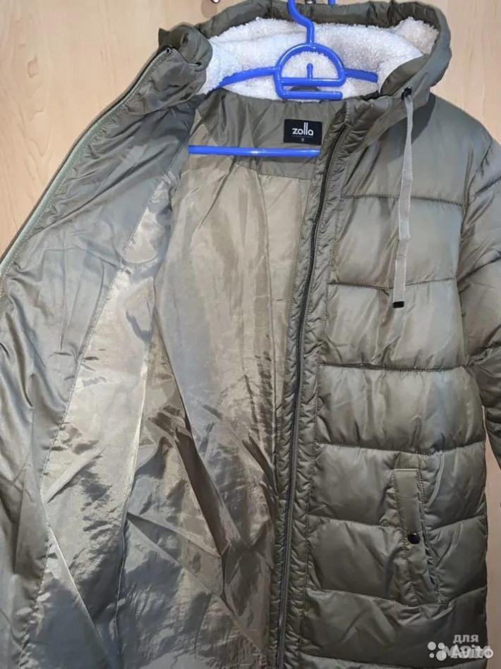 прямого кроя, по бокам маленькие разрезики 7см, капюшон не отстегивается, внутри капюшона искусственный мех, в рукавах трикотажные манжеты