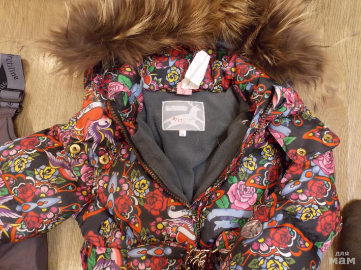 Комплект после химчистки.Состояние, я считаю, идеальное. Комп плохо отражает реальные цвета, на самом деле рисунок очень яркий, цвета насыщенные. Флис - в курточке: спинка до пояса, грудка, воротник, капюшон, карманы; спинка в штанах. Рассчитан на реальные морозы тоже. Манжеты в рукавах. Сидит на детках изумительно! Обычно идет в размер, то есть лучше покупать на вырост, но и в размер если брать можно ходить и когда рост уже больше. Потрясающая фурнитура.