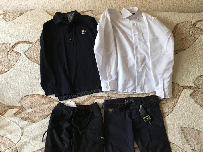 Джинсы синие Турция с втяжкой по поясу, тепленькие штаны очень приятные на ощуп на резинке по поясу, поло Турция белая рубашка ( есть след ржавчины от булавки на кармашке думаю отстирается)