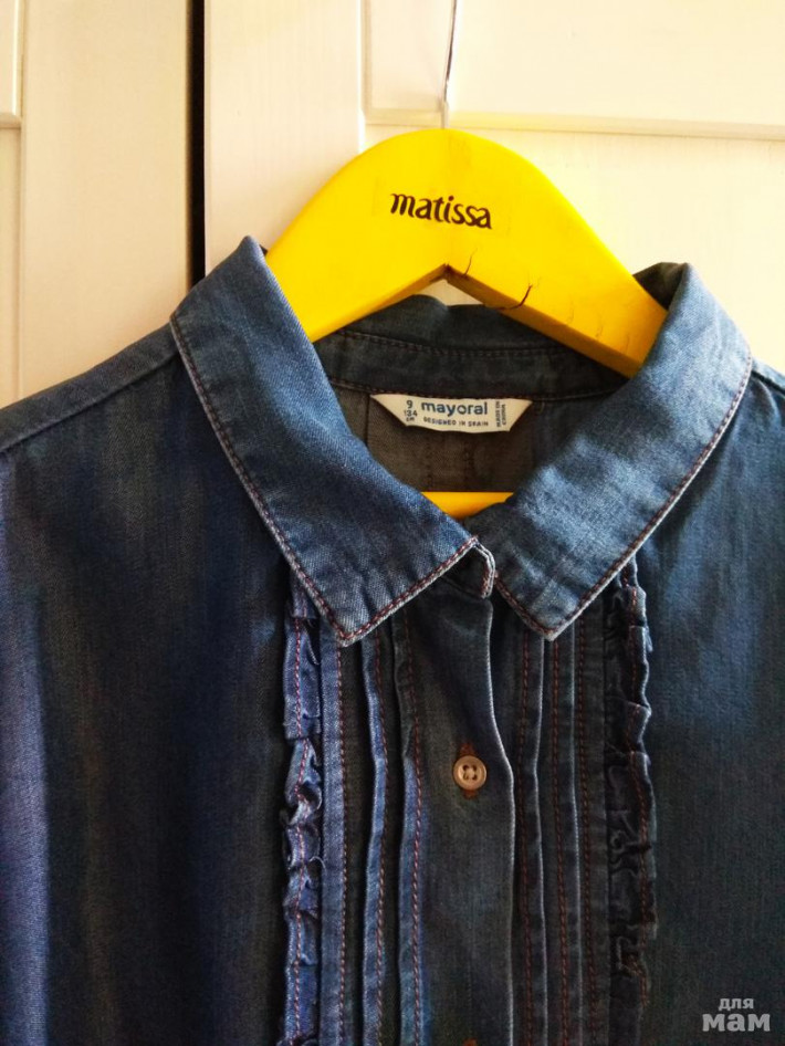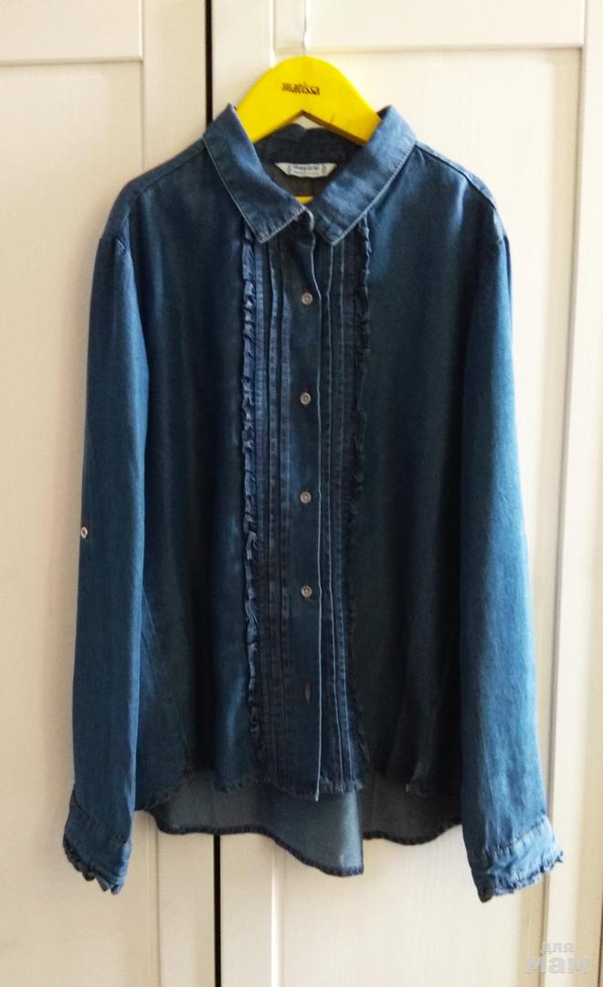 Рубашка для девочки Mayoral 9 лет. Цвет - деним, ткань - лёгкий, мягкий, струящийся, но достаточно плотный хлопок. На рукавах есть приспособления, чтобы закатать при желании. Очень качественная вещь, состояние новой.